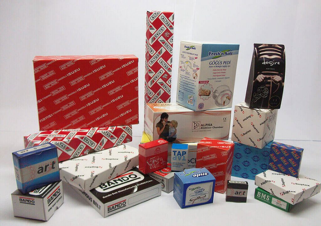 Bottom and side lock, glued boxes, acetate, windowed boxes, embossed, gilded, barrel or matte cellophane boxes, perforated boxes, separator boxes, boxes with carrying handles, Cardboard or Dopel boxes.